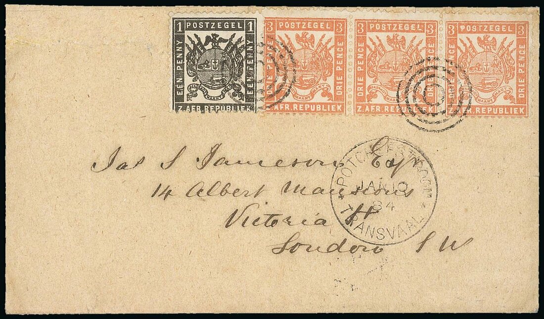 1884 (10 Jan.) envelope from Potchefstroom to London, bearing 1883 re-issue 1d. and 3d. pale red strip of three, both tied by circle of rings with despatch c.d.s. below and showing, on reverse, Cape Town (16.1) and arrival (6.2). A neat and attractive franking. Photo