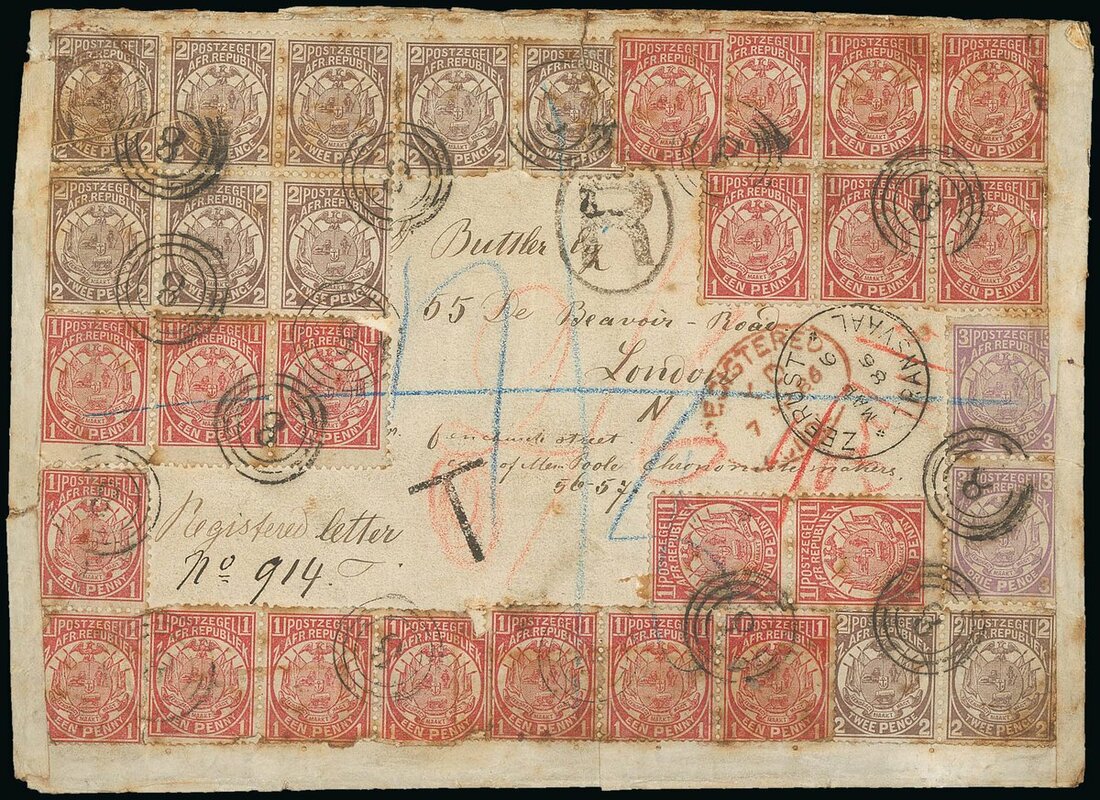 1886 (6 Mar.) envelope from Dr. Emil Holub, explorer of southern and central Africa, registered to London, posted in Zeerust bearing 1885 Vurtheim 1d. (20), 2d. (10) and 3d. (2), all cancelled "8" in concentric rings, showing despatch c.d.s., "T" h.s. with red crayon "2/6", red arrival d.s. and, on reverse, Potchefstroom and Returned Letter Office Cape Town datestamps; the stamps stained and/or damaged and the envelope edges strengthened using other paper and stamp selvedge. Despite the faults a most remarkable franking. Photo