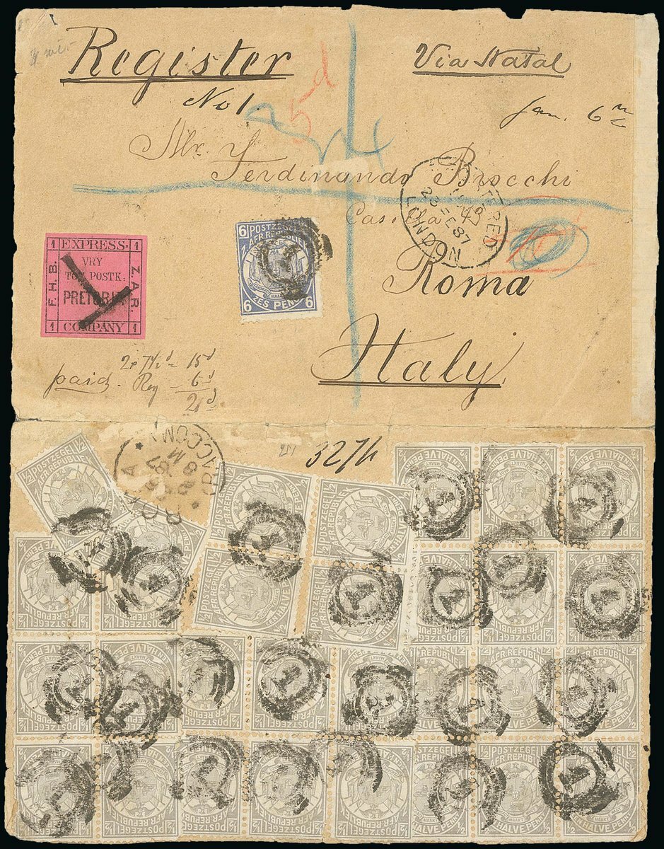 1887 envelope (opened-out and strengthened) registered from Pretoria to Italy, marked "Via Natal", bearing 1885 Vurtheim ½d. (30, all on reverse) and 6d. cancelled by "1" in concentric rings, in combination with Bakker Express Pretoria label centrally cancelled by handstruck "T", showing London transit d.s. (23.2) with Rome arrival c.d.s. (28.2) on reverse. A remarkable cover sent at the correct rate. Photo