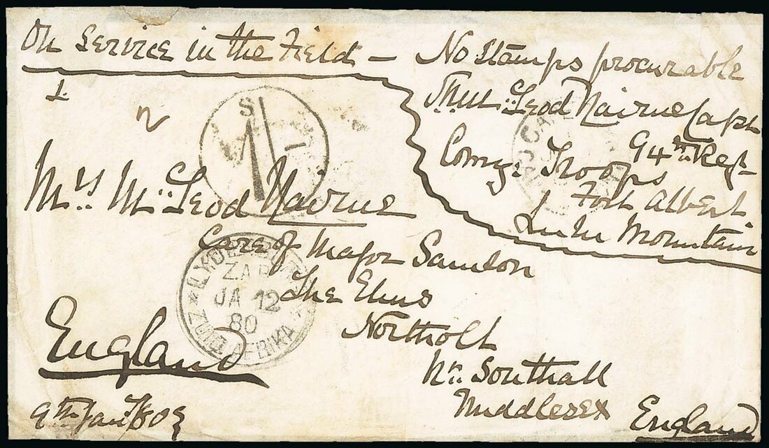 1880 unstamped envelope ex the Nairne correspondence to England, marked "On Service in the Field - no stamps procurable, J. McLeod Nairne Capt 94th Regt., Comg Troops, Fort Albert, Lulu Mountain", showing Lydenburg (12.1) and Cape Town datestamps, circular-framed "1s/-" h.s. with arrival c.d.s. on reverse. A rare officer's letter from this campaign. Photo