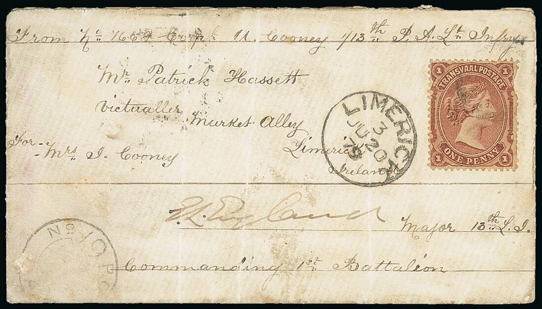 1879 soldier's envelope to Ireland, headed "From No. 1669 Corpl A Cooney 1/13th P.A.L. Infantry", countersigned by Commanding Officer, bearing 1878 1d. with unclear cancellation, showing Limerick arrival c.d.s. (20.6) alongside and, on reverse, GPO Natal (13.5) and Durban (14.5) transit datestamps; the envelope a little soiled. Photocopy of R.P.S. Certificate (1972). Photo