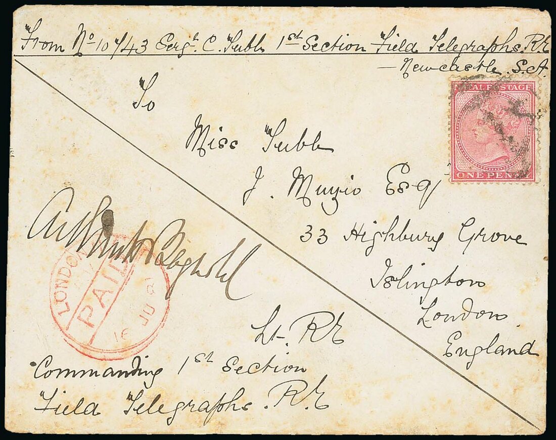 1881 soldier's envelope to London, headed "From No 10743 Sergt C Tubh 1st Section Field Telegraphs R.E., Newcastle", countersigned by Commanding Officer, bearing Natal 1d. with unclear cancellation and showing London Paid arrival c.d.s. (16.6) in red; the envelope with some light staining. Photo