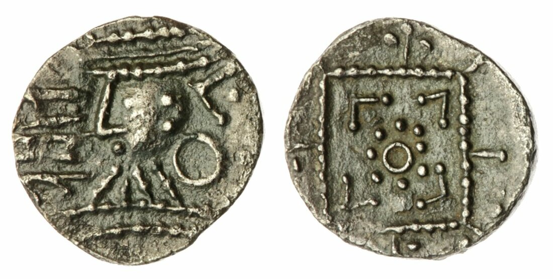 Anglo-Saxon England, Secondary Series (710-760), Sceat, Series R3, "Rigold" (R1Z var.), radiate bust left, short pyramidical neck, runes before, ^ large annulet behind bust, rev. beaded standard containing asymmetrical right angle to each corner and central annulet in pellet circle, cross pommée to three sides, line in left margin, diagonals at outer corners, 1.04g, 270° [?] (SL 11-30, plate coin; SCBI 69, 659 this coin; Timms 2020, R3, no. 21; T&S pp. 509-11, 396-400; North 153; Spink 813), toned but waterworn, a bolder very fine