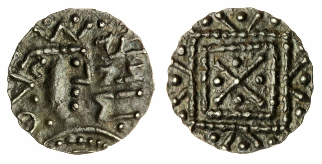 Anglo-Saxon England, Eclectic Series (710-760), Sceat, Series R/type 51 mule, Saltire standard, Epa, crude radiate bust right, angular ear, EPA before retrograde, chevron and pellet-in-annulet behind, curved linear and beaded exergual lines, rev. saltire within double beaded square, pellet in angles, pellets and tufa each side, 0.73g (SL 13-60, plate coin; SCBI 69, 720 this coin; Abramson, 2012b, Fig 17k; Beowulf 89 this coin; DMM pp. 532; North 159; Spink 833 plate coin), toned, good very fine and handsomely broad, scarce thus