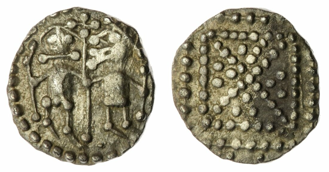 Anglo-Saxon England, Eclectic Series (710-760), Sceat, type 51, Saltire standard, variety P1ai, bird-headed figure on right looking across at moustached figure left, wearing cap, long cross pommée between and right, staff left, staff and crosses have pellet finials, rev. saltire in double beaded square, trefoils in angles, pellets in margins, 1.00g (SL 2, 13-80, rev. plate coin; SCBI 69, 723 this coin; Abramson and Bonser, 1999, 101/159; 104/177; 164/174, and Figs. 5.9a, 5.22; Abramson, 2012b, Fig 17j; T&S pp. 524-7, 432-3; North 153; Spink 833), light porosity, otherwise largely centred, a bolder very fine, very rare