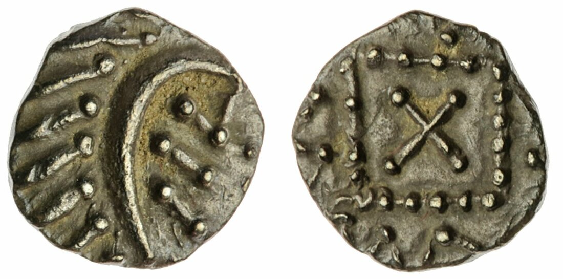 Anglo-Saxon England, Primary Series (710-760), Sceat, Saltire standard, Series E/SAROALDO mule, quilled crescent enclosing three bars, rev. saltire in beaded standard with letters in margin possibly reading SAROALDO, 1.06g (SL 13-130, plate coin; SCBI 69, 725 this coin), rub to high points, otherwise darkly toned, a really good very fine and very rare