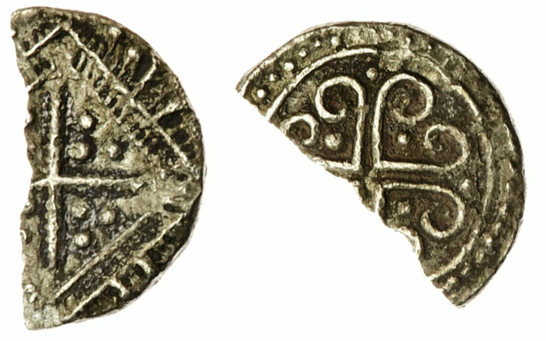Anglo-Saxon England, Eclectic Series (710-760), Sceat, Saltire standard, variety P1h, double croix ancrée, lobes open in quarters, pellet enclosed, double linear/beaded border, rev. saltire in double linear/striated standard, trefoils in angles, tufa to each side, 0.69g (SL 13-150; SCBI 69, 727 this coin; Spink 833A), a broken half fragment, with surface porosity and traces of lacquer, otherwise struck details better than very fine, very rare