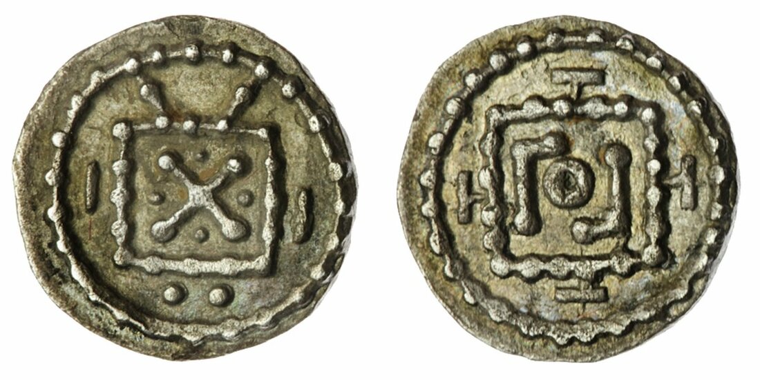 Anglo-Saxon England, Eclectic Series (710-760), Sceat, Saltire standard, type 70, Hill variety g/f, Saltire pommée in beaded standard, pellet in each angle, tufa above, bar left and right, two pellets below, beaded border rev. beaded standard with central annulet and two right angles, T to each side, beaded border, 1.05g (SL 13-170, plate coin; SCBI 69, 736 this coin), toned, good very fine, scarce