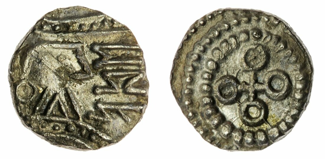 Anglo-Saxon England, Eclectic Series (710-760), Sceat, Annulet cross, Epa, degenerate bust right, EPA before, annulet behind, linear pyramidical neck, curved exergual lines, rev. annulet cross in double beaded border, 1.13g (SL 14-20; SCBI 69, 747 this coin), light porosity, otherwise very fine, very rare