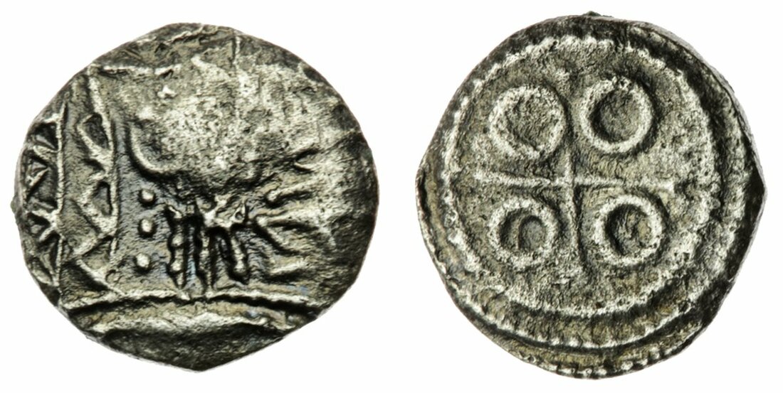 Anglo-Saxon England, Eclectic Series (710-760), Sceat, Annulet cross, Epa, degenerate bust right, EPA before, three pellets behind linear pyramidical neck, curved exergual lines, two vertical rows of chevrons left, rev. irregular cross fourchée with large annulet in each quarter, 1.18g (SL 14-25, plate coin; SCBI 69, 748 this coin), struck with a broken obverse die, waterworn and lightly porous, otherwise toned, fine or marginally better, extremely rare