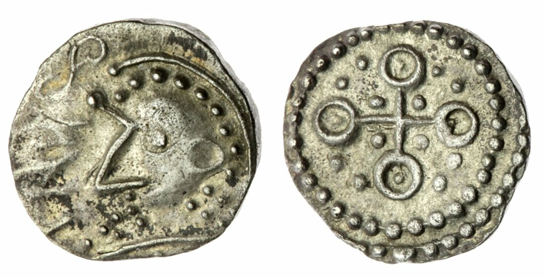 Anglo-Saxon England, Eclectic Series (710-760), Sceat, Annulet cross variety, "wedge-face" degenerate bust left, Z-shaped brow and nose, headdress of linear and pellet lines, vestigial runic (?) legend before, short beaded pyramidical neck rests on curved exergual line, rev. annulet cross, a pellet in each annulet, trefoils in angles, within double beaded border, 1.14g (SL 14-40, plate coin; SCBI 69, 751 this coin), lightly toned, a most endearing coin, good very fine and very rare