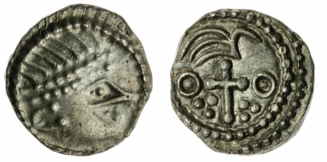 Anglo-Saxon England, Primary Series (680-710), Sceat, Series BIIIA3, diademed head right, angular nose, prominent jaw, crescent ear, no legend visible in margin, rev. linear bird on cross pommée, pellet-in-annulets on limbs, trefoils in lower quarters, double beaded border, 1.13g, 0° (SL 16-80; SCBI 69, 72 this coin; T&S pp. 158-65. 156-7 and 304-5; Gannon 36, 47, 48, no. 173, 107-10, 112, 136, 184, 184, no. 18, and Figs. 2.18a, 4.1b, and 4.5; North 126; Spink 777A), slightly waterworn, otherwise good very fine / near extremely fine, scarce