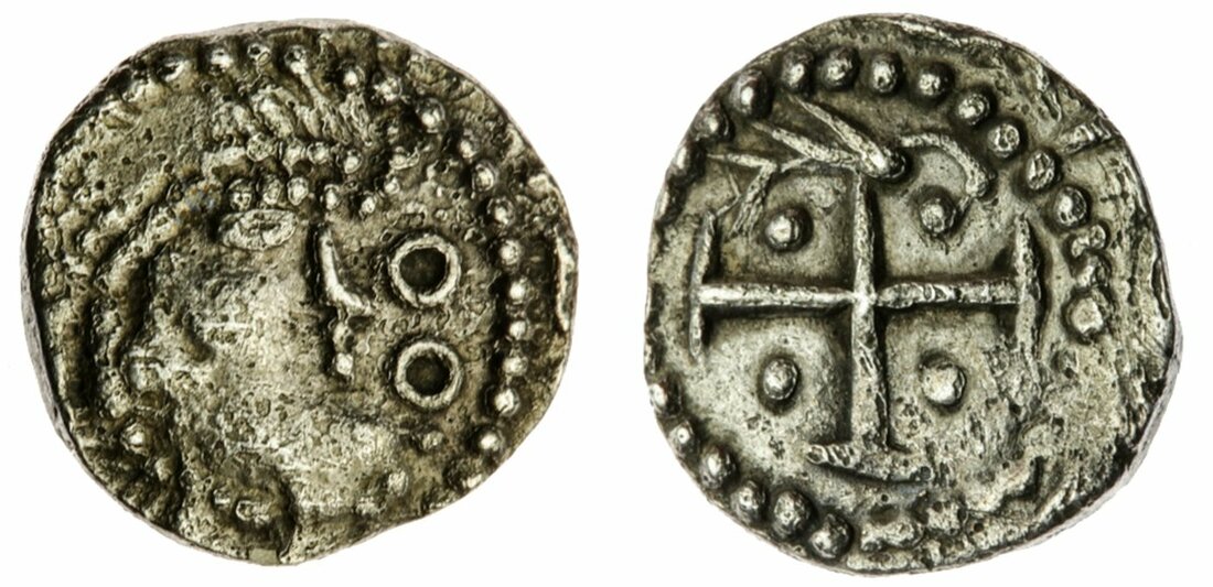 Anglo-Saxon England, Primary Series (680-710), Sceat, Series BIII, Imitative, crude diademed head right, slit eye, two pellets form lips, two annulets before, 'Prognasthous' chin, vestigial legend in margin, rev. elongated bird on Maltese cross, pellet in each angle, beaded border, vestigial legend in margin, 1.27g, 270° (SL 2, 16-90, plate coin; SCBI 69, 77; T&S pp. 133-7, 138-9; Gannon: 26, 28, no. 38, 29, 39, 107, no. 5, 160, Fig. 2.2), waterworn and lightly porous, about very fine, rare