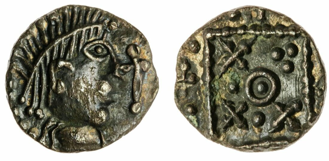 Anglo-Saxon England, Secondary Series (710-760), Sceat, Series G, type 3a, unusually large diademed and draped bust right, with radiating hair, almond-shaped eye, crescent ear, long curved cross pommée before, rev. diamond standard, central pellet-in-annulet, cross pommée above and to sides, trefoil below, pellets between, 1.02g, 270° (SL 21-20; SCBI 69, 314 this coin; Spink 800), some scuffing on cheek and deposits in recesses, a finely incised and rather charming portrait, almost extremely fine