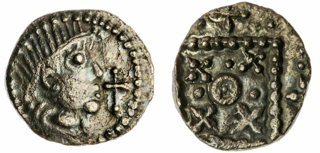 Anglo-Saxon England, Secondary Series (710-760), Sceat, Series G, type 3a, diademed and draped bust right, radiating hair, beads before, almond-shaped eye, crescent ear and collar, cross pommée before lips, rev. beaded standard, central pellet-in-annulet, saltire crosses in corners, pellets between, 1.00g (SL 21-30; SCBI 69, 319 this coin; Spink 800), slightly waterworn and darkly toned, the reverse in high relief, very fine, the reverse bolder, scarce