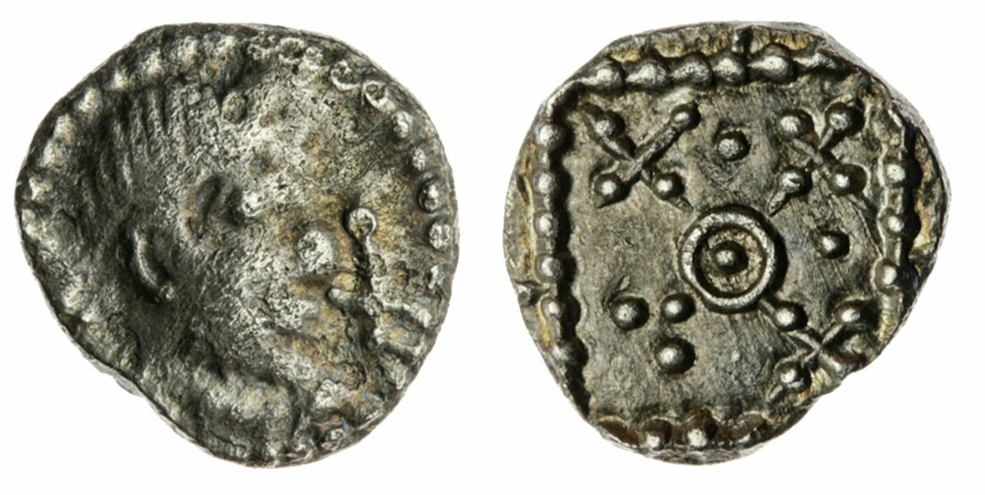 Anglo-Saxon England, Secondary Series (710-760), Sceat, Series G, type 3a, diademed, draped bust right, radiating hair, beads before, almond-shaped eye, crescent ear and collar, cross pommée before lips, rev. diamond standard, central pellet-in-annulet, cross pommée above and to sides, trefoil below, pellets between, 1.00g, 0° (SL 21-30; SCBI 69, 321 this coin; Spink 800), waterworn and lightly porous on obverse, otherwise toned, fine / extremely fine, scarce