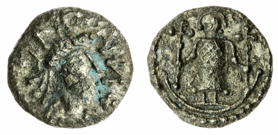 Anglo-Saxon England, Secondary Series (710-760), Sceat, Series L, type 12, diademed and draped bust right, wreath-ties unknotted, small cross pommée before, legend LVNDONI^ surrounds head, rev. standing figure in cynehelm, head right, standing in crescent boat with pellet ends, wearing cross-hatched tabard and plain tunic with pellet ends, long cross pommée either side, pellets on shafts of crosses, 1.10g, 180° (SL 23-10; SCBI 69, 495 this coin; MEC 8 Series La; North 63; Spink 804), verdigris staining in recesses and somewhat waterworn, trace porosity, otherwise a bolder fine / very fine