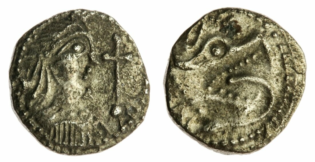 Anglo-Saxon England, Secondary Series (710-760), Sceat, Series K, obverse C-D, type 33 (cf. Reculver), diademed and mantled bust right, wreath ties unknotted, almond-shaped eye, globus cruciger held before, rev. lion head right, chevron mane, erect ear, pellet eye, snaking tongue, 1.08g, 180° (SL 38-10; SCBI 69, 426 this coin; Abramson, 2008, Fig 12; Gannon 59, no. 237, 64-5, 131-2, 134, 135, 139, 156, 178, no. 155, 189, no. 62, and Figs. 2.48b, 2.49a, 2.58, 4.35b, 4.36a, 4.36d; North 93; Spink 803), lightly porous although largely centred, very fine, the reverse better but for traces of waterwear