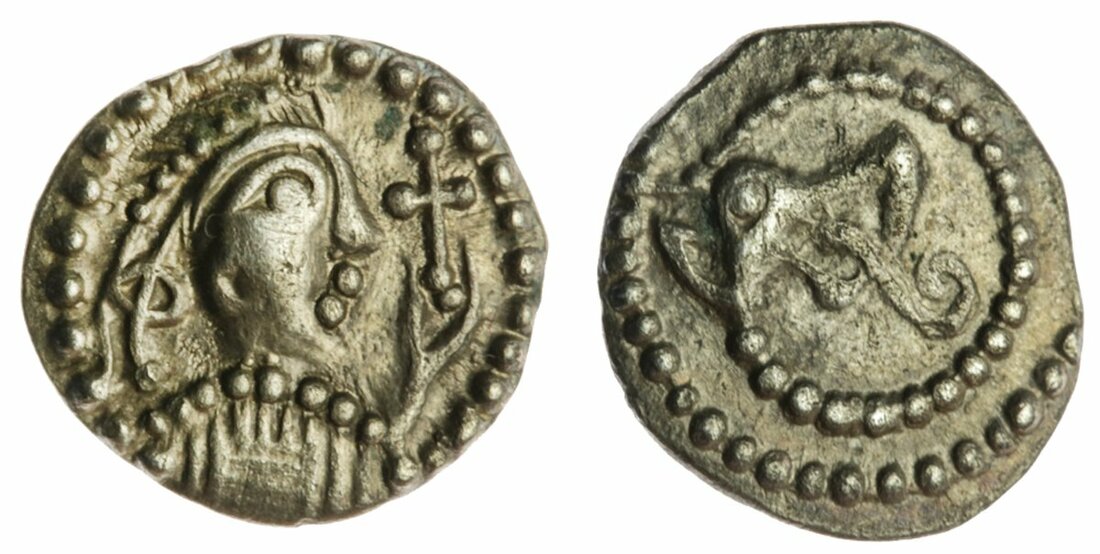 Anglo-Saxon England, Secondary Series (710-760), Sceat, Series K, type 32a, diademed and draped bust right, almond-shaped eye gazing heavenward, small mouth, braided hair, knotted wreath ties behind, hand cupping cross pommée before with pellet in palm, rev. serpent headed, coiled, 'lion', right, with long upward curling tongue extended between fangs, erect ear, circular eye, beaded body encircling, beaded border, 0.99g, 270° (SL 39-10; SCBI 69, 407this coin; Abramson, 2012b, Fig 1a; T&S pp. 385-8 and 395-402, 307-10; Gannon 35, 71, 72, 131, 137,139-40, 175, 187-8, and Figs. 2.15, 2.48a, 4.44, 4.46b, 4.47, and 6.1; North 89; Spink 803C), a lovely example, a pleasing very fine or better but for faint traces of porosity, desirable thus