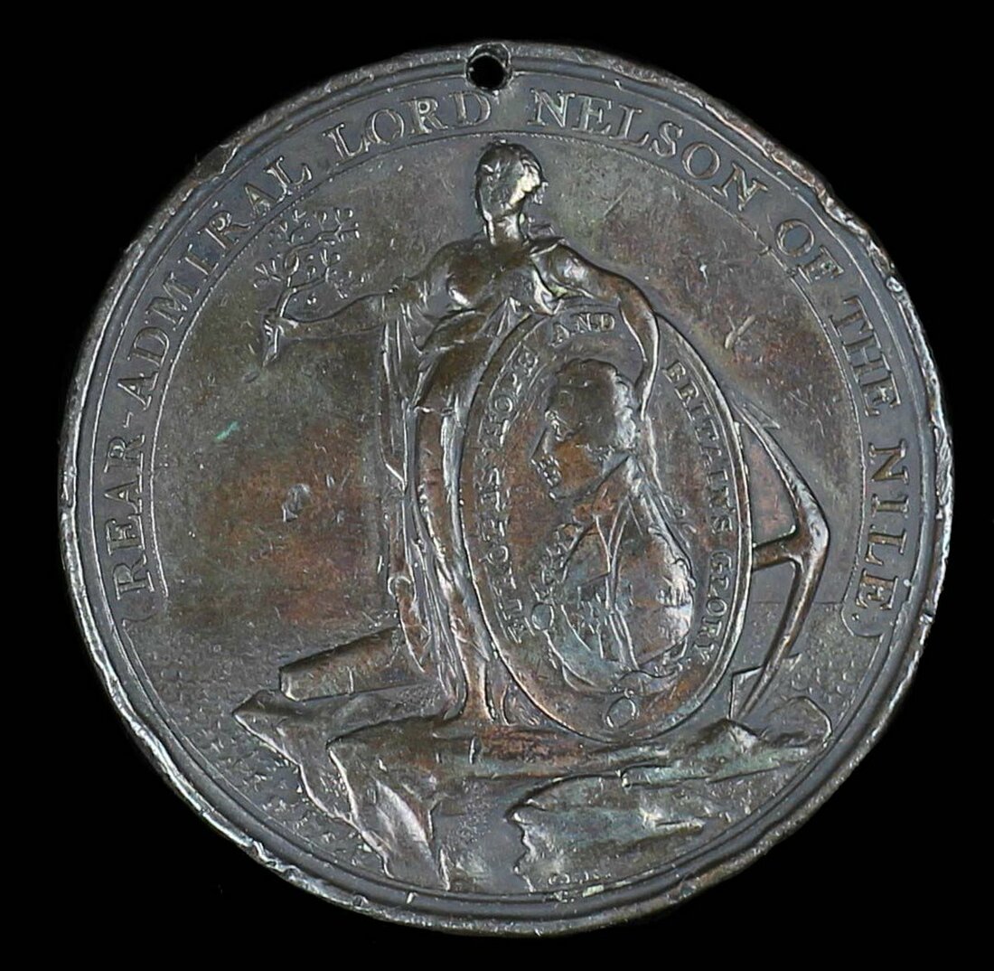 Alexander Davison’s Medal for The Nile 1798, bronze, unnamed, pierced at 12 o’clock, edge bruising, worn in parts, therefore fine