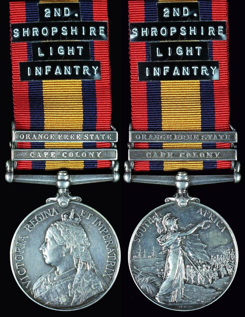 Queen's South Africa 1899-1902, 2 clasps, Cape Colony, Orange Free State (2801 Pte B. Layland, 2nd Shropshire Lt Infy), contact marks, very fine
