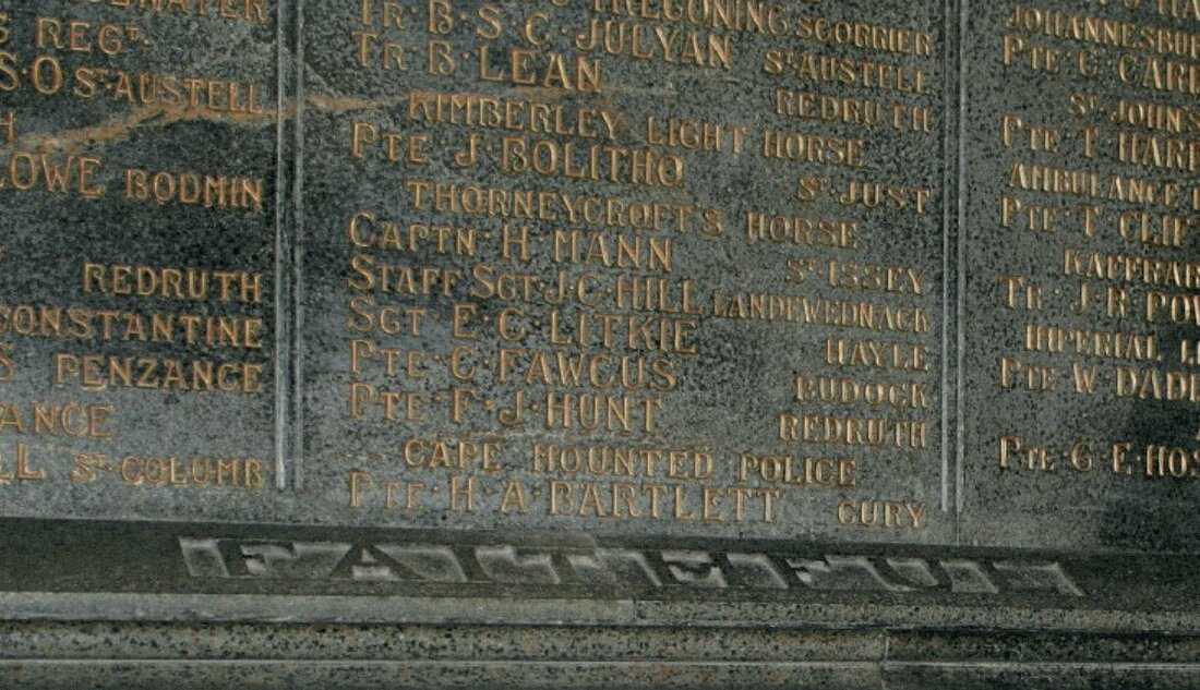 James 'Jim' Bolitho was a scion of the famous Cornish family. He was killed in action at Platberg on 31 December 1901 and is commemorated upon the Boer War Memorial at Truro Cathedral. A poignant obituary notice was published in The Cornishman on 6 February 1902: