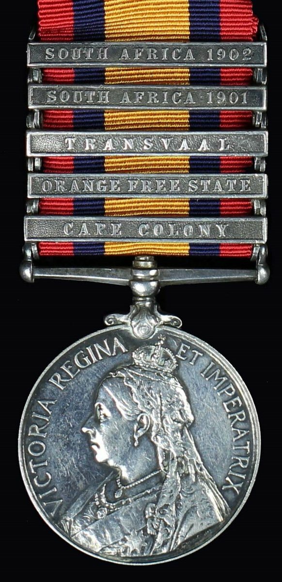 Queen's South Africa 1899-1902, 5 clasps, Cape Colony, Orange Free State, Transvaal, South Africa 1901, South Africa 1902 (178 Pte. J. Hill. Hampshire Regt.), unofficial rivets between state and date clasps, very fine