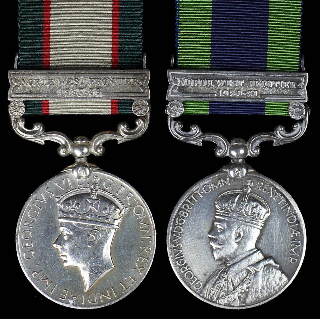 India General Service 1908-35, 1 clasp, North West Frontier 1930-31 (6459 Sep. Sher Afzal. S. W. Scouts.); India General Service 1936-39, 1 clasp, North West Frontier 1937-39 (9798 Sep. Khawanda Noor. S. W. Scouts.), both with traces of adhesive to reverse, nearly very fine (2)