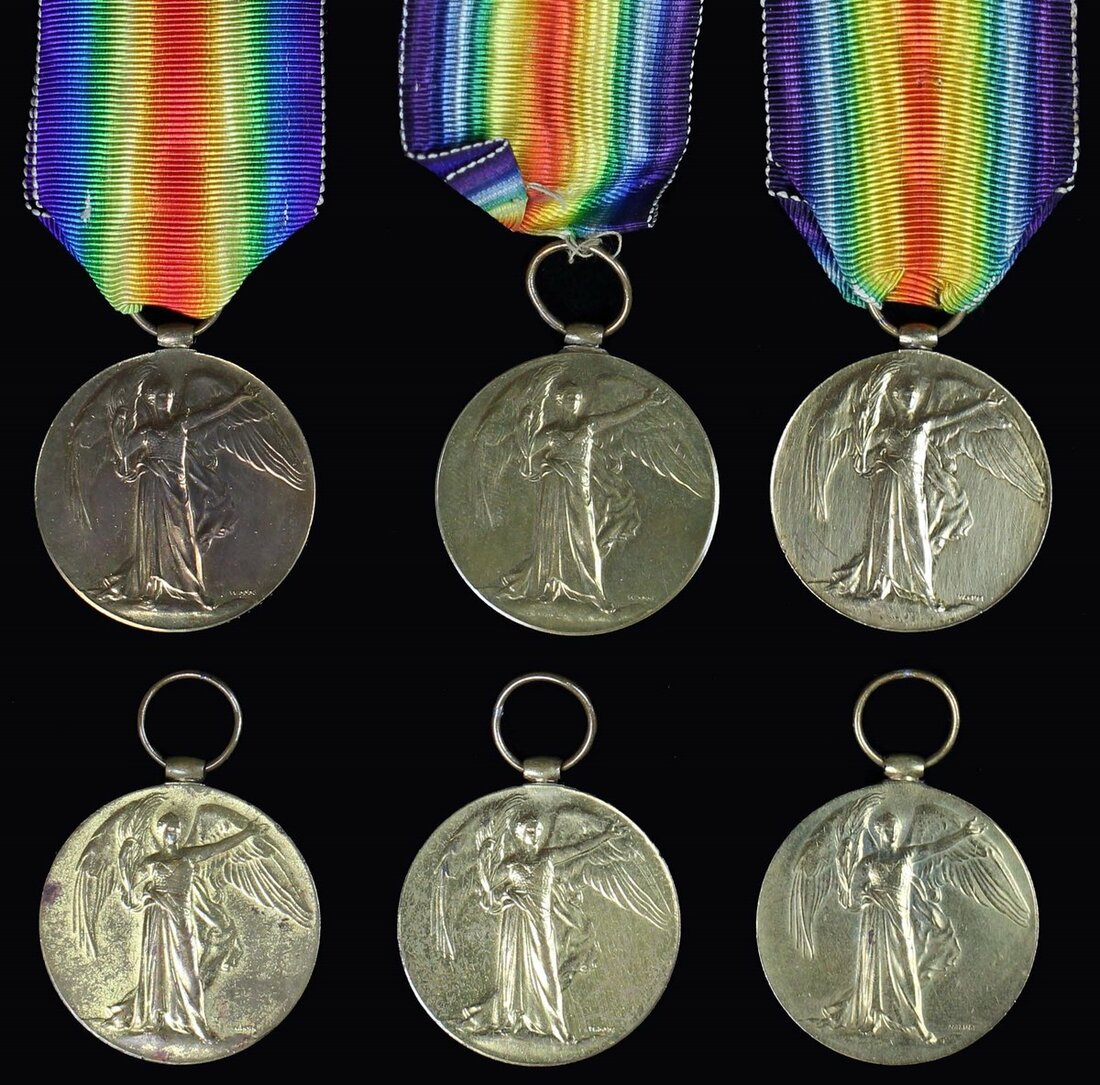 Victory Medal 1914-19 (6) (239274 Gnr. E. S. Cross. R.A.; 31158 Pte. J. F. Shelswell. Glouc. R.; Cpl. W. Craddock. R.A.; 93309 Gnr. W. J. Pain. R.A.; 240691 Pte. R. A. G. Bevan. Devon. R.; 120785 Spr. W. J. Bartlett. R.E.), very fine (6)