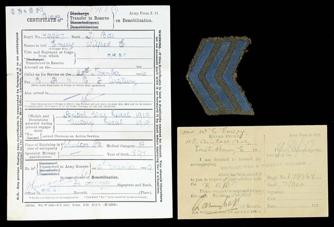 Wilfred Ernest Emery was born at Forest Gate, London on 19 April 1897, the son of John Woodley Gosling and Elizabeth Smith Emery. Enlisting at Stratford on 20 November 1916, Emery served in France from 29 March 1917. Serving there with a number of formations including 13th Reserve Brigade, 255th Brigade and 48th Brigade until 1 April 1919, he was posted to Germany on 2 April 1919 eturning to Britain on 9 November 1919. Transferred to the Reserve on 12 December 1919, Emery died at Great Cliff Rest Home, Dawlish, Devon on 10 December 1983; sold together with copied research including service records, M.I.C. and original certificate of discharge as well as Overseas stripes and note of issue.