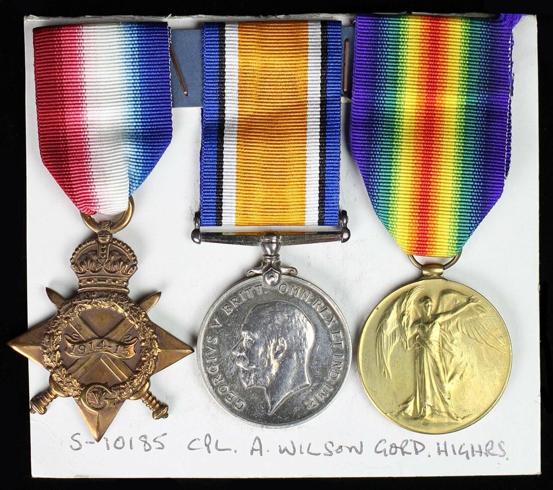1914-15 Star (S-10185. Pte. A. Wilson, Gord. Highrs.); British War and Victory Medals (S-10185 Cpl. A. Wilson. Gordons.), contact marks, very fine (3)