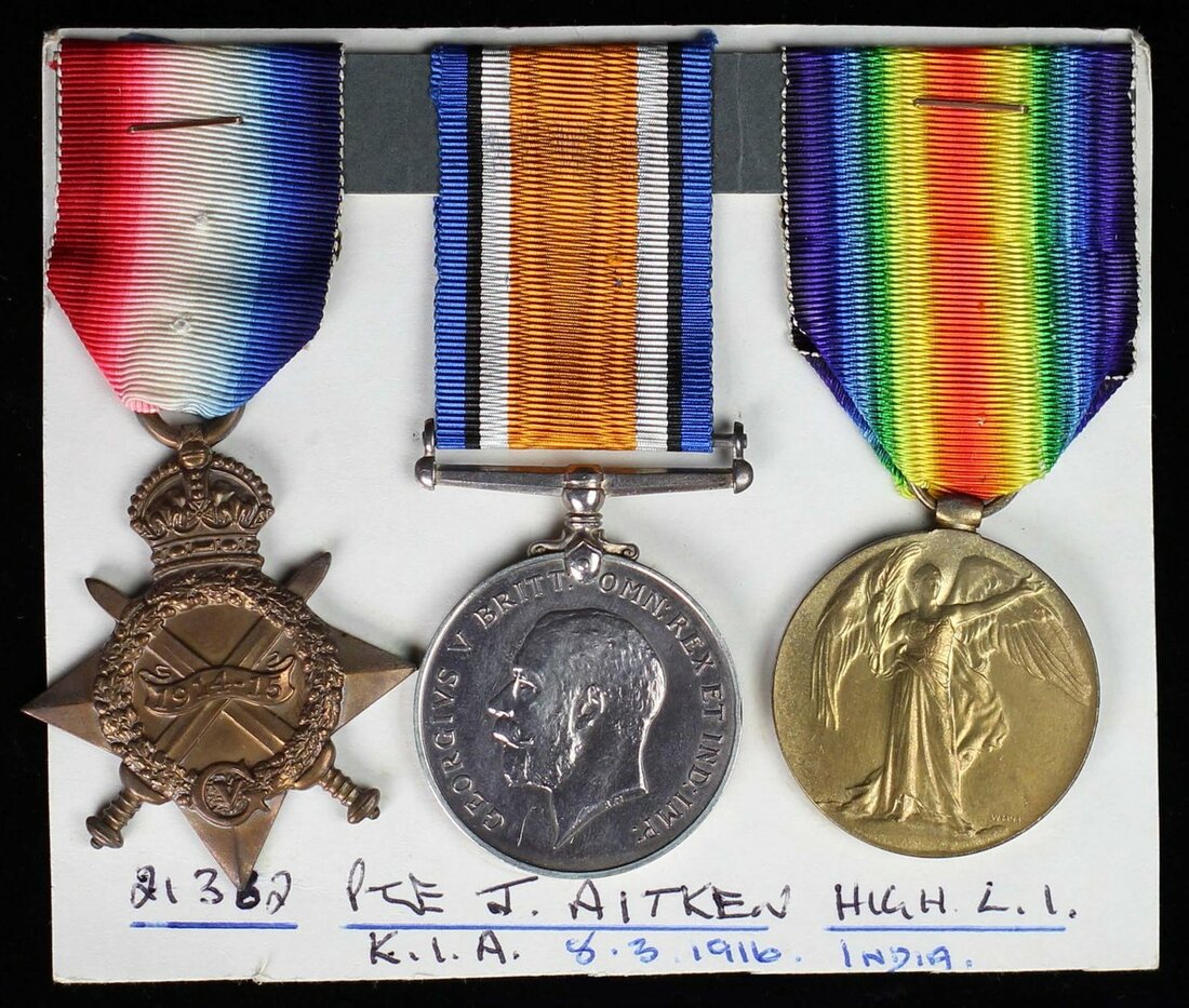 1914-15 Star (21382 Pte J. Aitken. High: L.I.); British War and Victory Medals (21362 Pte. J. Aitken. H.L.I.), good very fine (3)