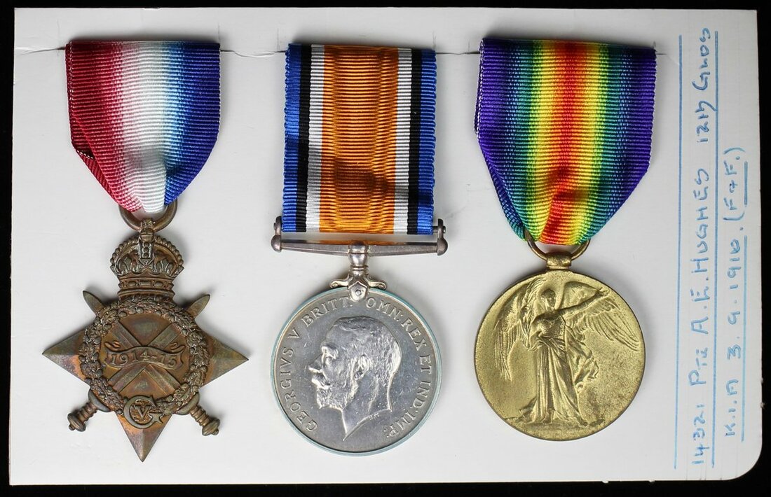 1914-15 Star (14321 Pte A. E. Hughes. Glouc:R.); British War and Victory Medals (14321 Pte. A. E. Hughes. Glouc. R.), verdigris, minor pitting, very fine (3)