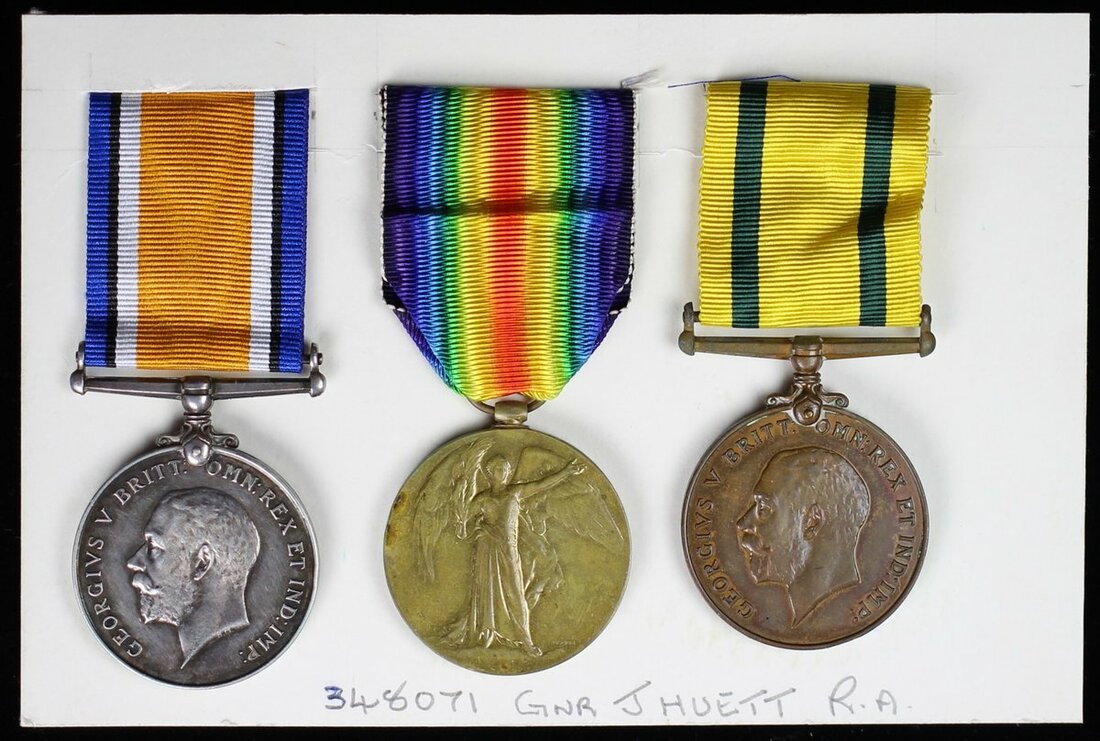 British War and Victory Medals (348071 Gnr. J. Huett. R.A.); Territorial Force War Medal 1914-1919 (329 Gnr . J. Huett. R.A.), polished, edge bruise, very fine (3)