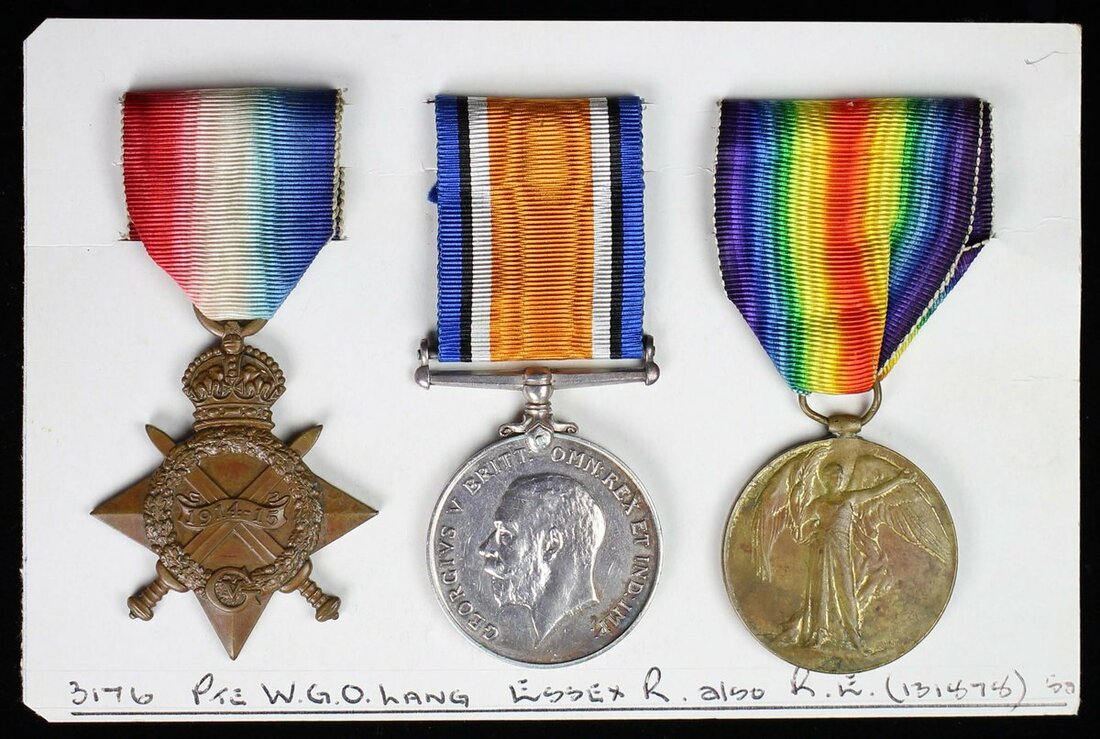 1914-15 Star (3176 Pte. W. G. D. Lang. Essex R.); British War and Victory Medals (3176 Pte. W. G. D. Lang. Essex R.), contact marks, pitting, nearly very fine (3)