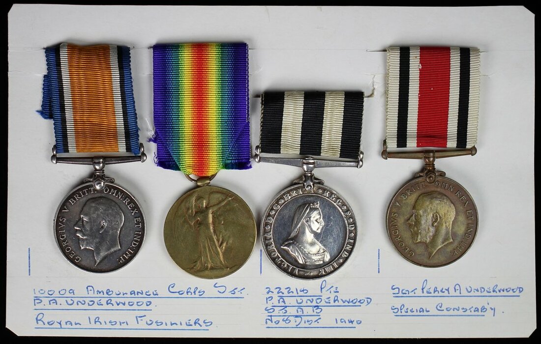 Percy Arthur Underwood was born at Stoke in June 1890. Enlisted with 1st Battalion, Royal Irish Fusiliers on 18 August 1908, he entered the war in France on 22 August 1914. Underwood was discharged on 14 July 1919 with the rank of Acting Quartermaster, further entitled to 1914 Star, with clasp and roses and Silver War Badge, No. B340783.