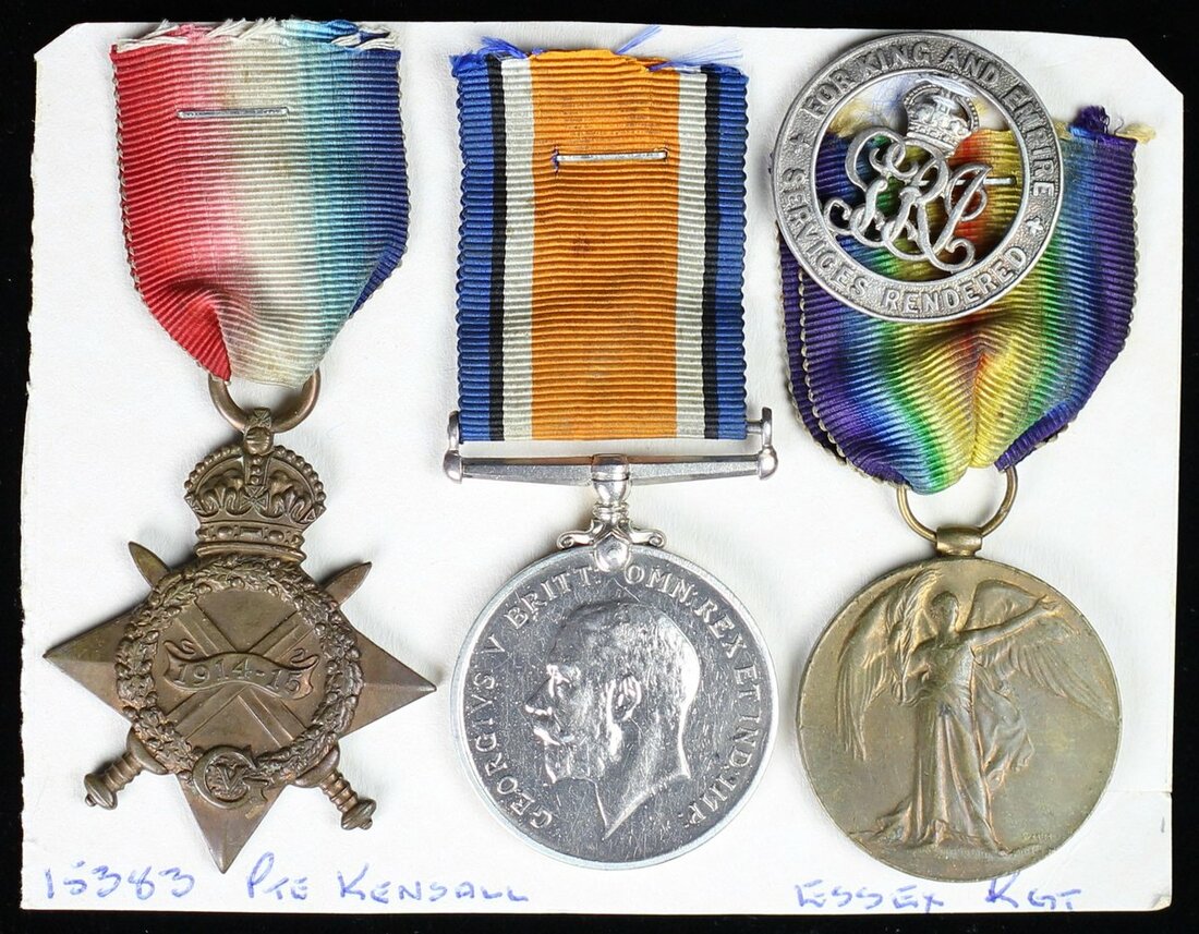 Percy Walter Kensall was born on 1 October 1883 at Halstead, Essex. He enlisted with the Essex Regiment on 11 October 1914 and joined the war in France on 25 July 1915. Transferring to the Northamptonshire Regiment on 16 March 1917 he was discharged on 30 January 1918 with a note: 'no longer physically fit'. Upon rejoining the army on 5 July 1921 he served with 4th Battalion, Suffolk Regiment until 1 October 1928; sold together with copied M.I.C.