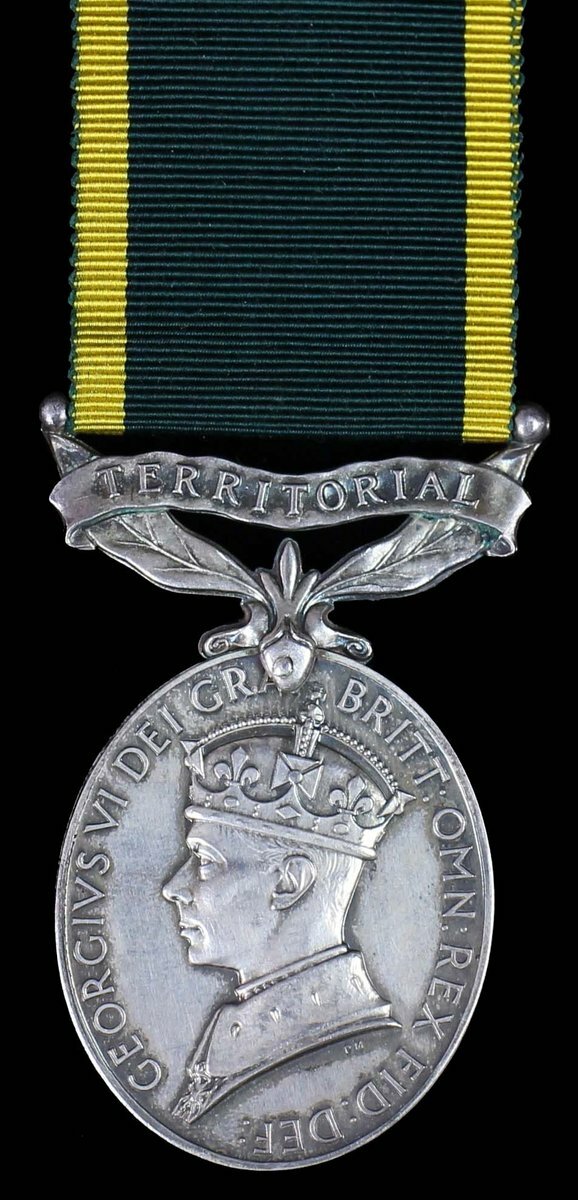 Arthur Thomas Hulett was commissioned 2nd Lieutenant on 16 March 1940 and was awarded this Medal as Honorary Major on 6 March 1947. It appears he never personally received the award, for he is listed as having died whilst serving with the 121 (4th Battalion, The Leicestershire Regiment) Light Anti-Aircraft Regiment on 6 January 1947, being commemorated at the Gilroes Cemetery and Crematorium, Leicester.