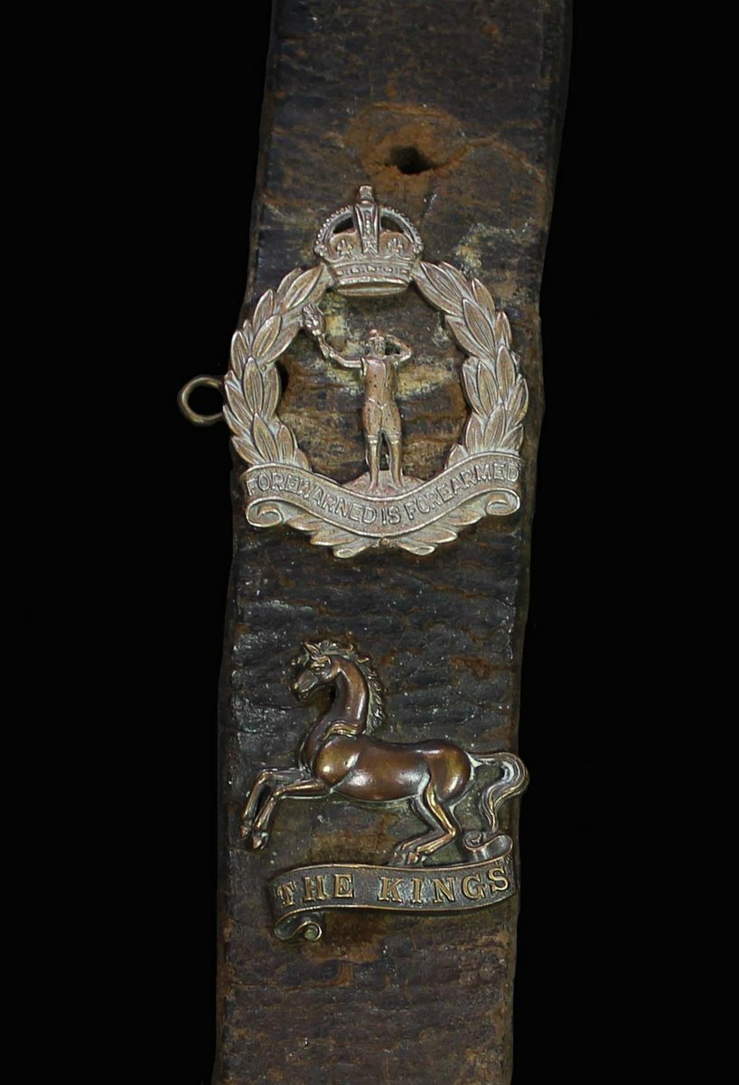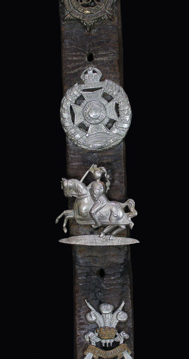 Two leather belts threaded with various British cap badges, leather rather degraded, good fine (2)