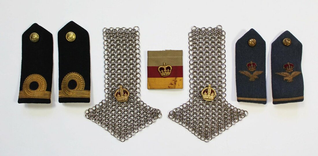 Including a naval pair by Joseph Starkey; an Air Force pair by Gieves Limited; a set of chainmail epaulettes displaying the rank of Major and one rank slide, last somewhat stained otherwise very fine (4)