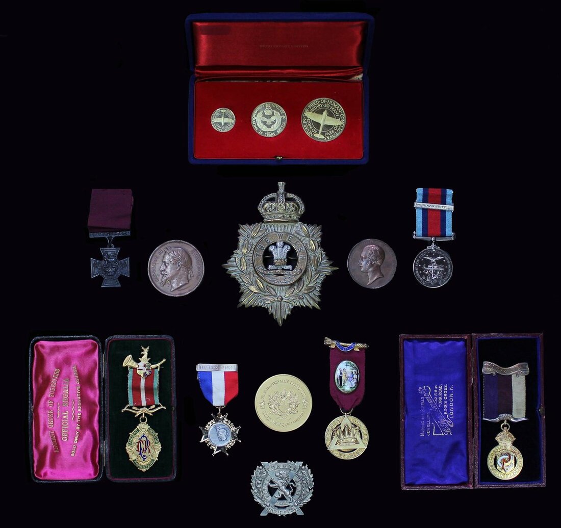 Miscellaneous Badges, Medals and Jewels, comprising three Masonic Jewels, Battle of Britain Commemorative Coin set, Lord Mayor of London 1972-73 (Lord Mayor Mais) commemorative Medal, N.R.A. bronze Medal, Normandy 1944 Medal, copy Victoria Cross, Exhibitions of Industry Medal, Napoleon III Great Britain & Ireland Commission Medal, case for an Imperial Service Medal, besides a number of boxes of issue for Second World War awards, very fine (Lot)