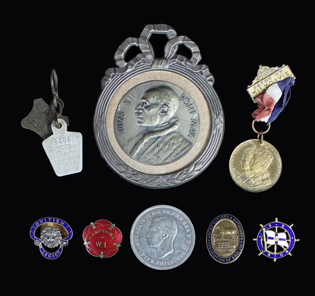 Including badges to the Guides and Scouts; badges of the British Legion, numbered; Nelson Centenary badge, containing 'Victory' copper; a six cent coin from the Transvaal republic in a metal frame; a set of 'dog tags' dated to 1938 noting that the wearer is 'vaccinated against rabies'; three pins with photographs attached depicting General Kitchener, General Buller and Lieutenant-General White; a pin with a photograph attached depicting Queen Victoria; two badges to the Women's Constitutional Association and the Hampshire Woman's Institute; a Pius XII commemorative medal mounted in a plastic frame, generally very fine (Lot)