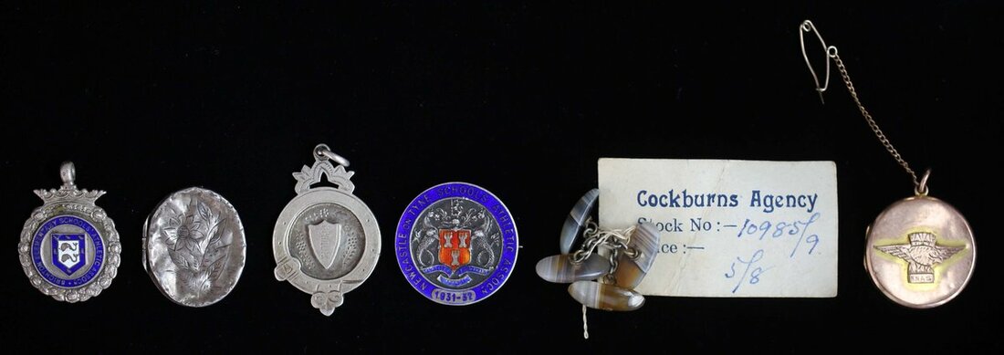 Including RNAS Sweetheart Locket, hallmarked for 9-carat gold, containing two pictures of an RNAS officer; Sweetheart Locket containing picture of women, silver, hallmarked; Newcastle-on-Tyne Schools Athletic Association badge 1931-32, silver and enamel, hallmarked; Brighton Elementary Schools Athletic Association, silver and enamel, hallmarked; Runner-up R.E. boxing championship badge, Bournemouth 1911, silver, hallmarked, second severely dented, fine, otherwise overall very fine (Lot)