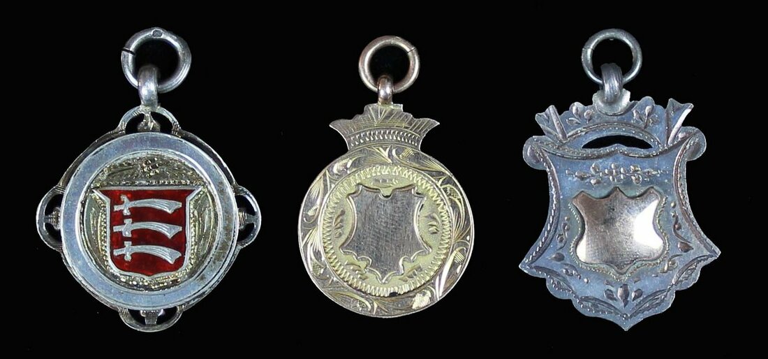 Three Fob badges in gold and silver