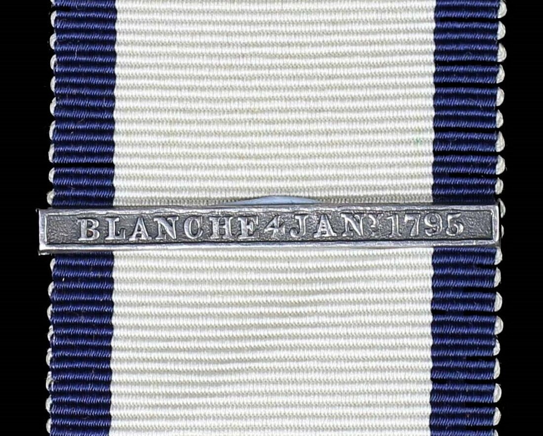 Just 5 'Blanche 4 Jany 1795' clasps issued - Joseph Clark, Boy 3; Thomas Evans, A.B. (Known; also entitled to Blanche 19 December 1796 but clasp not on medal); Henry Greely (Known; also entitled to Blanche 19 December 1796 but clasp not on medal); Thomas L. Prescott, Lieut. R.N. (National Maritime Museum); Frederick Watkins, Lieut. R.N. (Known).
