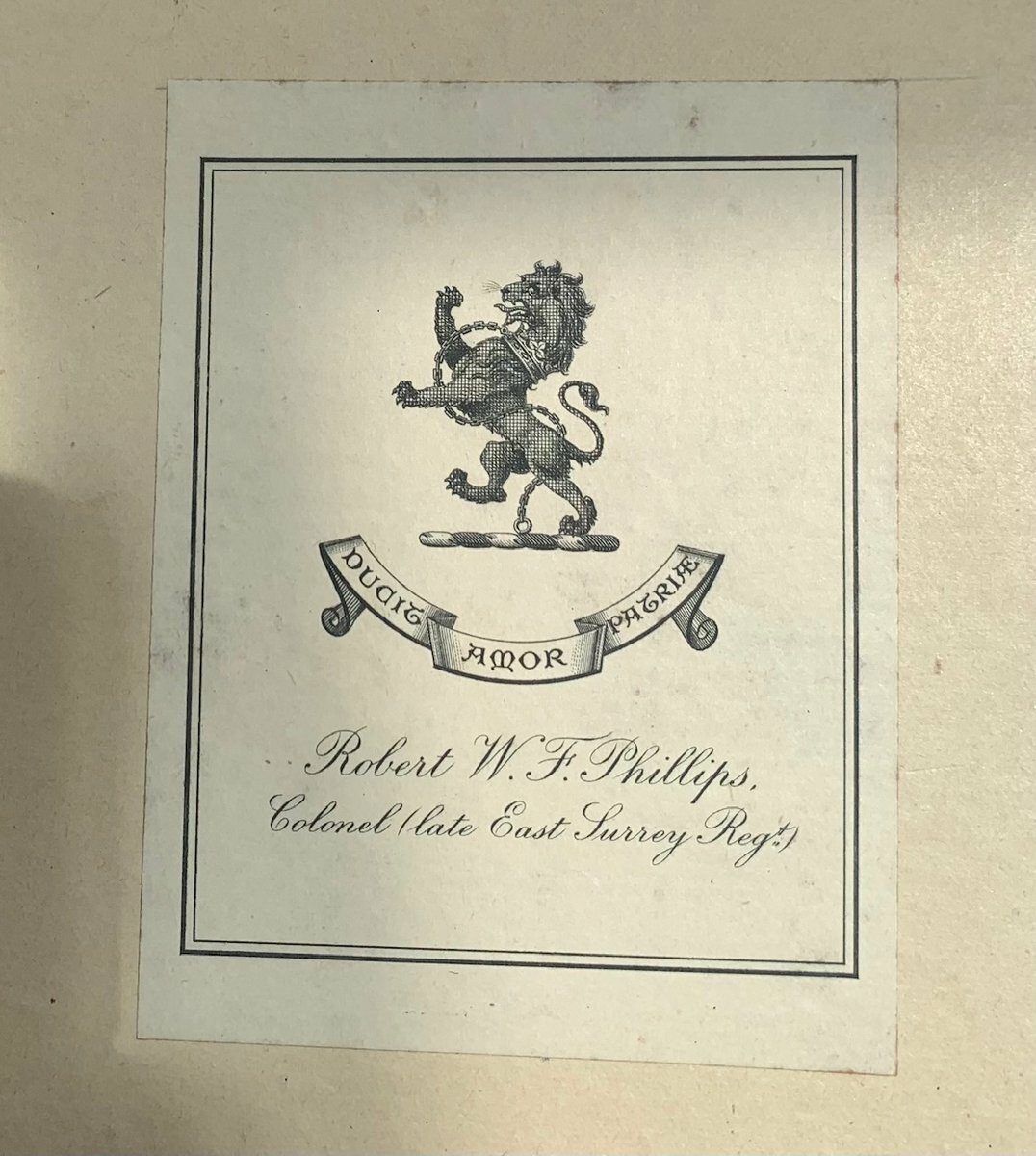 Books; History of the East Surrey Regiment, 1st and 2nd Battalions, Volume 1 (1702-1914), by Colonel H. W. Pearse, D.S.O., 1st Edition printed by Spottiswoode, Ballantyne & Co, London, 1916, with inscription and book plate of Colonel R. W. F. Philips, edges knocked and some wear, very fine