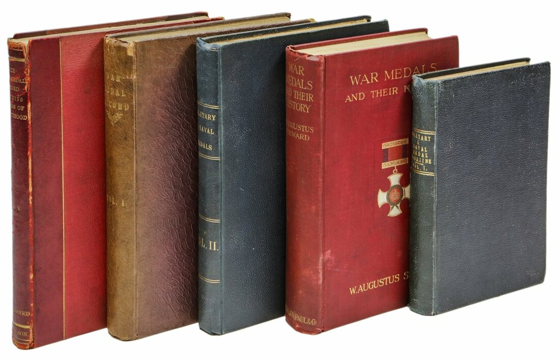 Books: War Medals and Their History, W. Augustus Steward (London, 1915); The Medal Record, Volume I & II, with Tancred Library Plate in Vol. II; Military & Naval Medal Magazine, Volume I & II, edited by Douglas Glendining, from October 1895-September 1897, some wear, very fine (5)