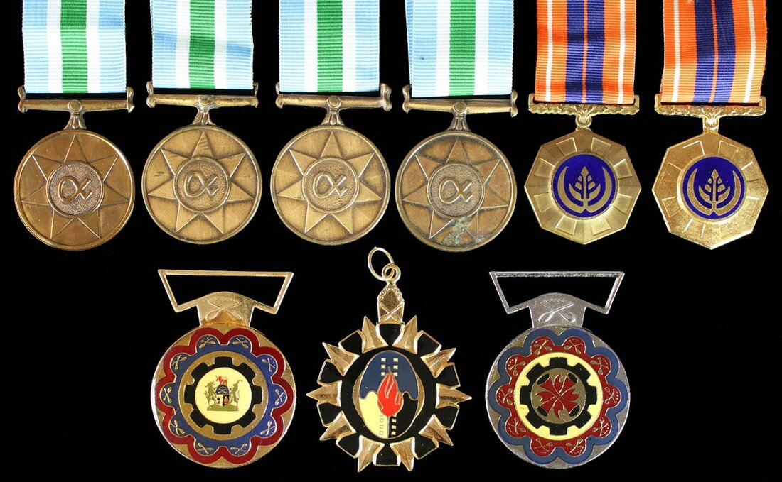 South Africa, Distinguished Service Medal; Star for Merit; Faithful Service Medal; Pro Patria Medal (2), both officially numbered; Unitas Medal, very fine (9)