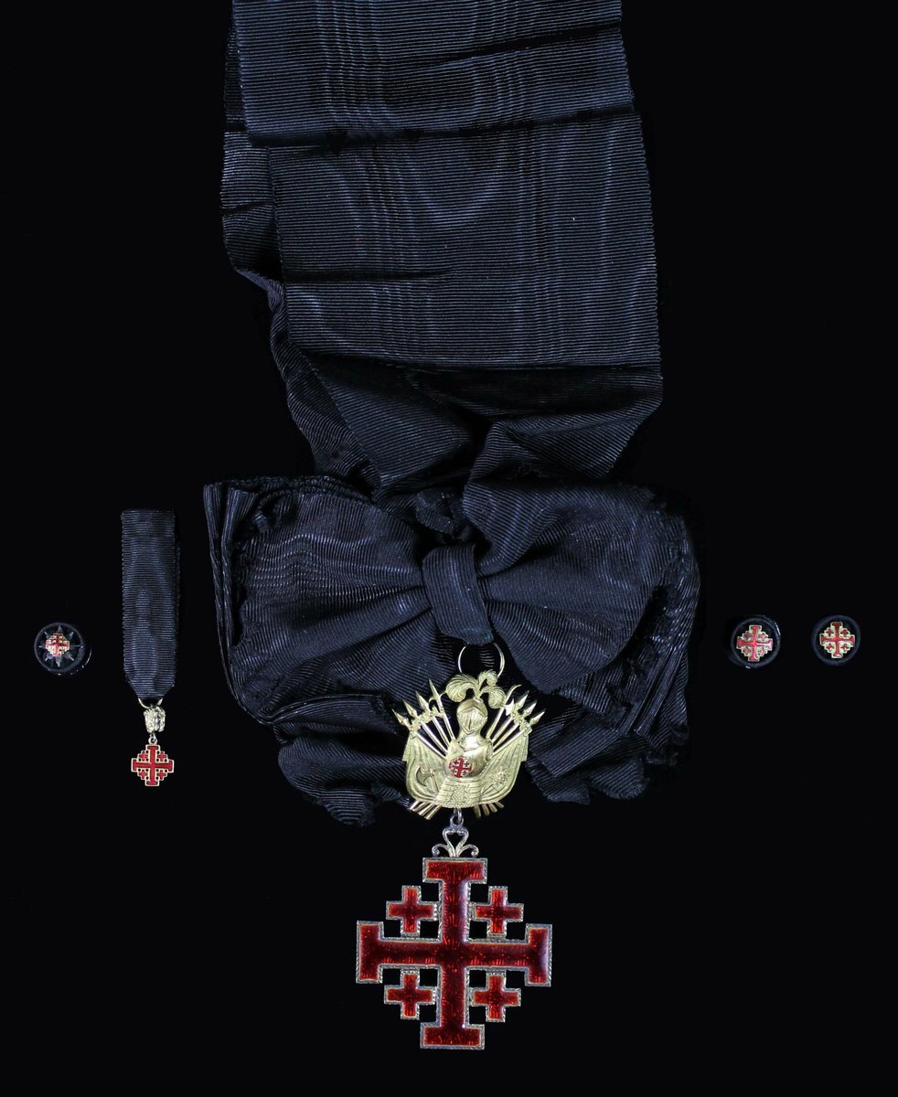 Vatican, Holy See, Order of the Holy Sepulchre, sash Badge, 104mm including trophy of arms suspension x 52mm, gilt and enamel, very fine, with full sash riband and in damaged case of issue, two boutonnieres and miniature award