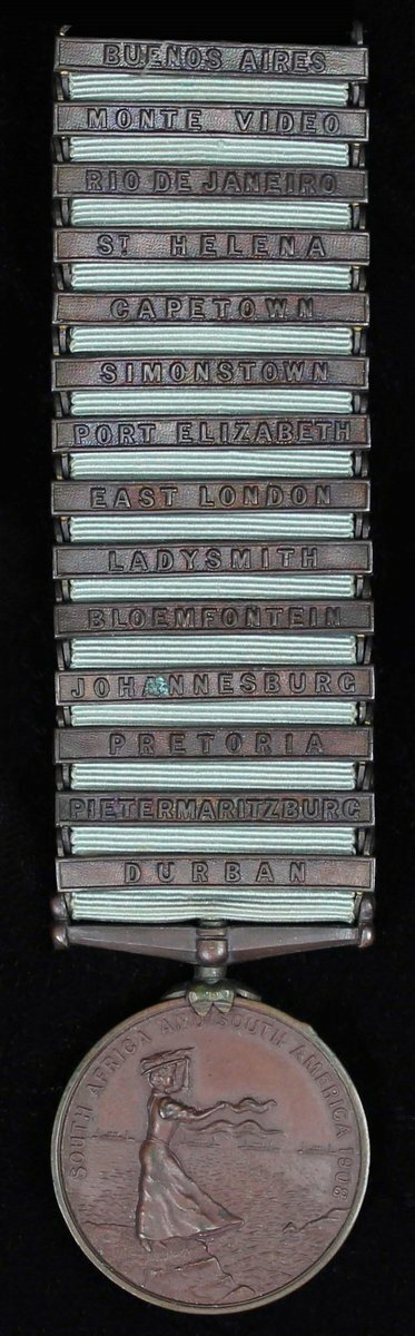 2nd Cruiser Squadron’s Medal for South Africa and South America 1908, 14 clasps, Durban, Pietermaritzburg, Pretoria, Johannesburg, Bloemfontein, Ladysmith, East London, Port Elizabeth, Simonstown, Capetown, St. Helena, Rio de Janeiro, Monte Video, Buenos Aires, unnamed, very fine